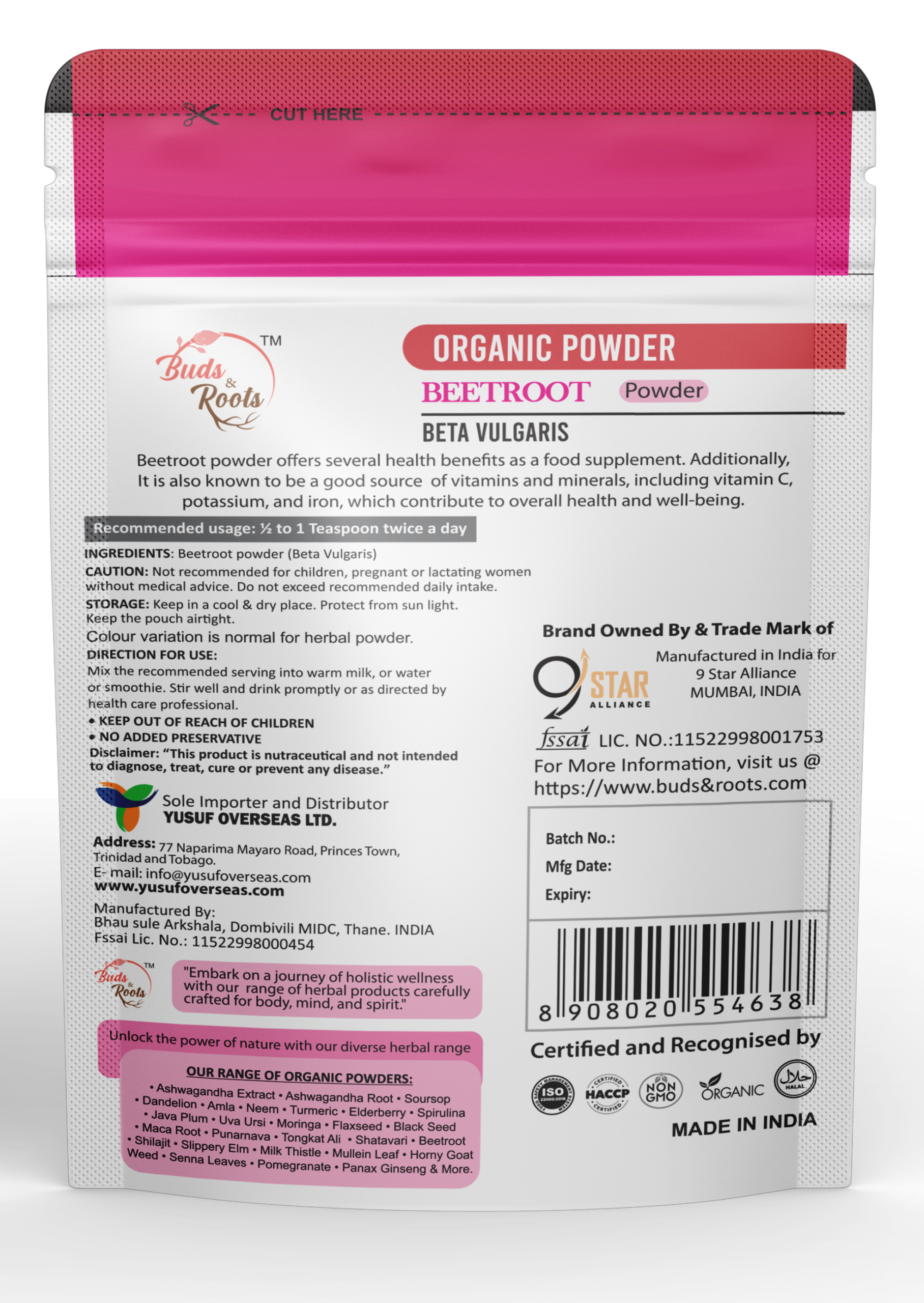 Buds & Roots Beetroot Organic Powder is a nutrient-rich superfood made from carefully selected organic beetroots. This finely processed powder retains the natural goodness of beetroot, offering a convenient way to boost daily nutrition. Packed with essential vitamins, minerals, and antioxidants, it supports energy, stamina, and overall wellness. It can be easily mixed into water, smoothies, juices, or even used in skincare routines for natural glow and vitality.Beetroot powder is known for its natural nitrates, which help improve blood circulation and support heart health while enhancing physical performance and endurance