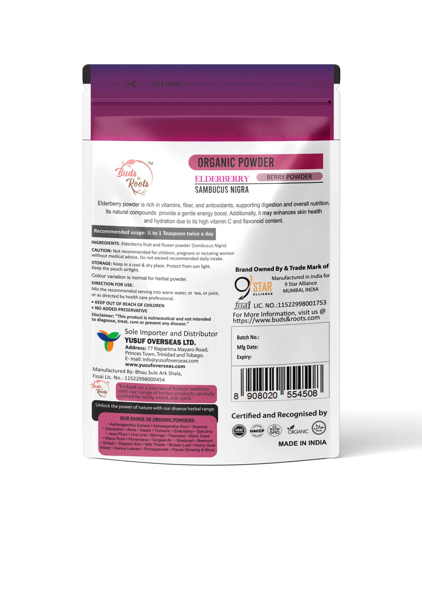 Buds & Roots Elderberry Powder is made from carefully selected elderberries that are dried and finely ground to preserve their natural nutrients. Elderberries have long been valued in traditional wellness practices for their rich antioxidant content and immune-supporting properties. Naturally containing beneficial plant compounds, elderberry powder helps support seasonal wellness, daily vitality, and overall health. Its versatile nature makes it easy to incorporate into smoothies, beverages, and wellness recipes.