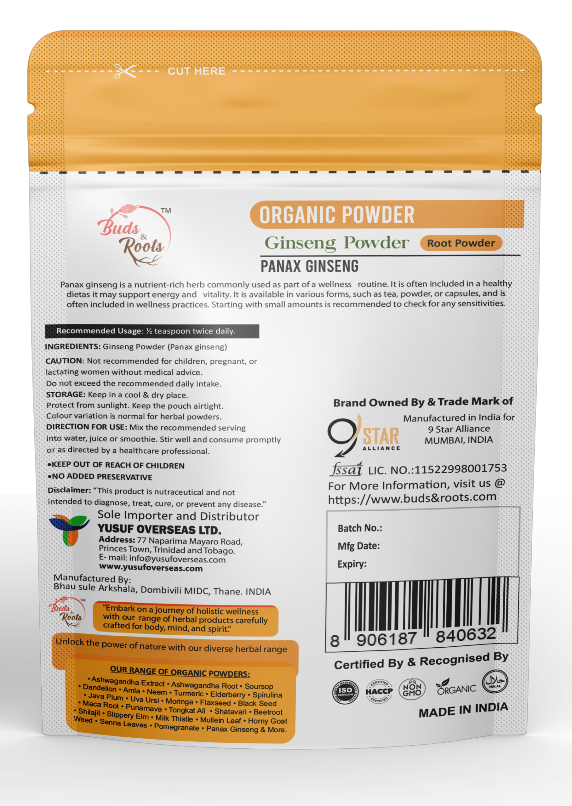 Buds & Roots Ginseng Organic Powder is a premium herbal supplement made from high-quality Panax ginseng root, known for its powerful adaptogenic properties. Traditionally used in natural wellness practices, ginseng helps enhance energy, improve mental performance, and support overall vitality. This organic powder is carefully processed to retain its natural potency, making it a perfect daily addition for a healthy and active lifestyle. Ginseng is widely valued for boosting stamina, reducing fatigue, and supporting the body’s ability to manage stress naturally.