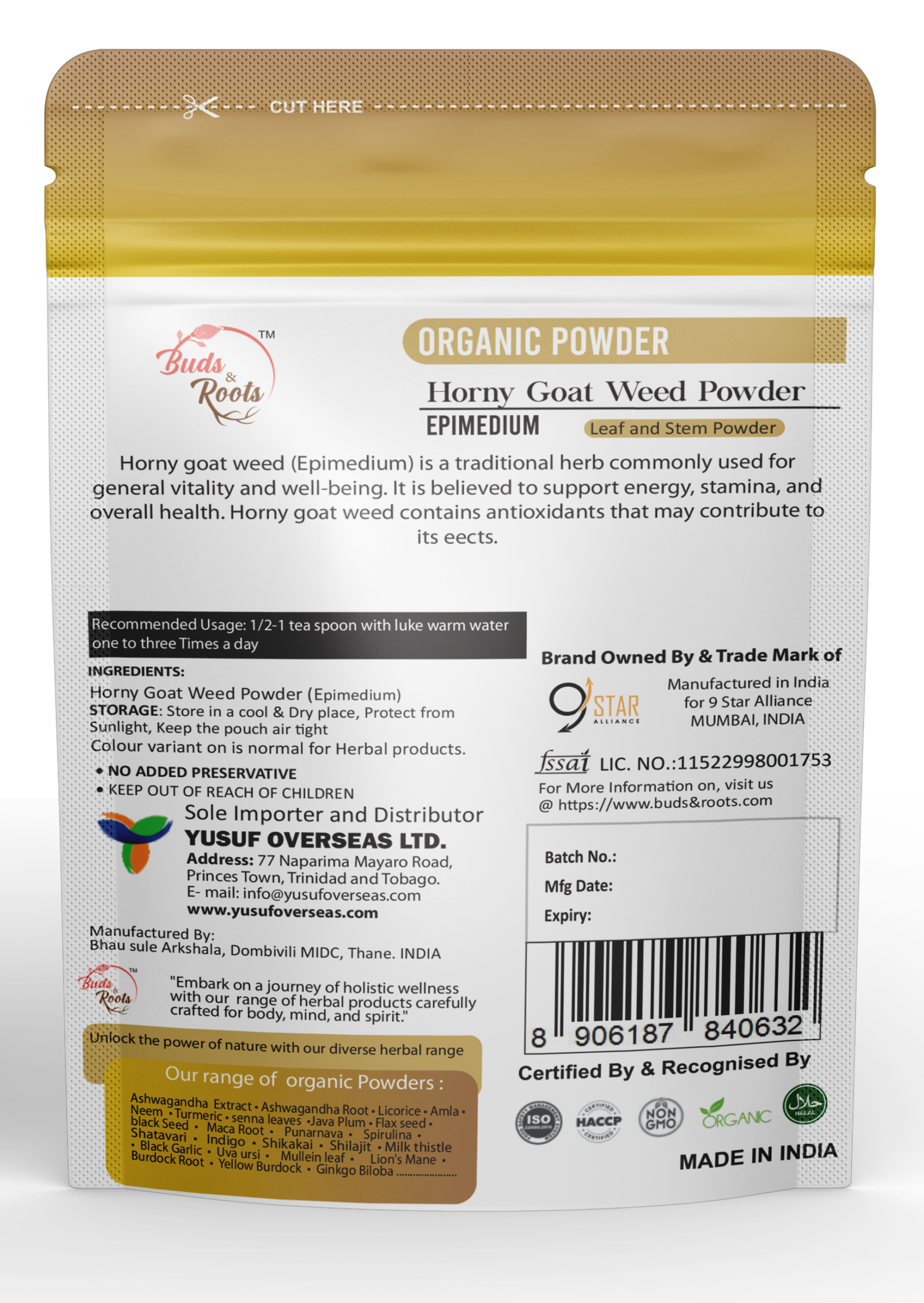 Buds & Roots Honey Goat Weed Organic Powder is a premium herbal formulation made from high-quality Horny Goat Weed (Epimedium), traditionally known for enhancing vitality, stamina, and overall wellness. Rich in natural compounds like icariin, this organic powder supports energy levels, physical performance, and hormonal balance. It is carefully processed to retain maximum potency, making it an ideal daily supplement for active and health-conscious individuals.