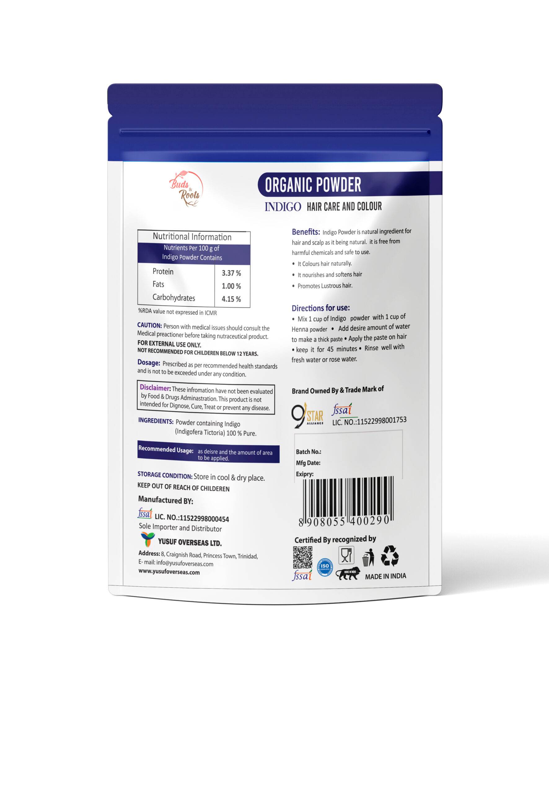 100% Pure Indigo Leaf Powder: Made from premium-quality indigo leaves with no additives or preservatives.