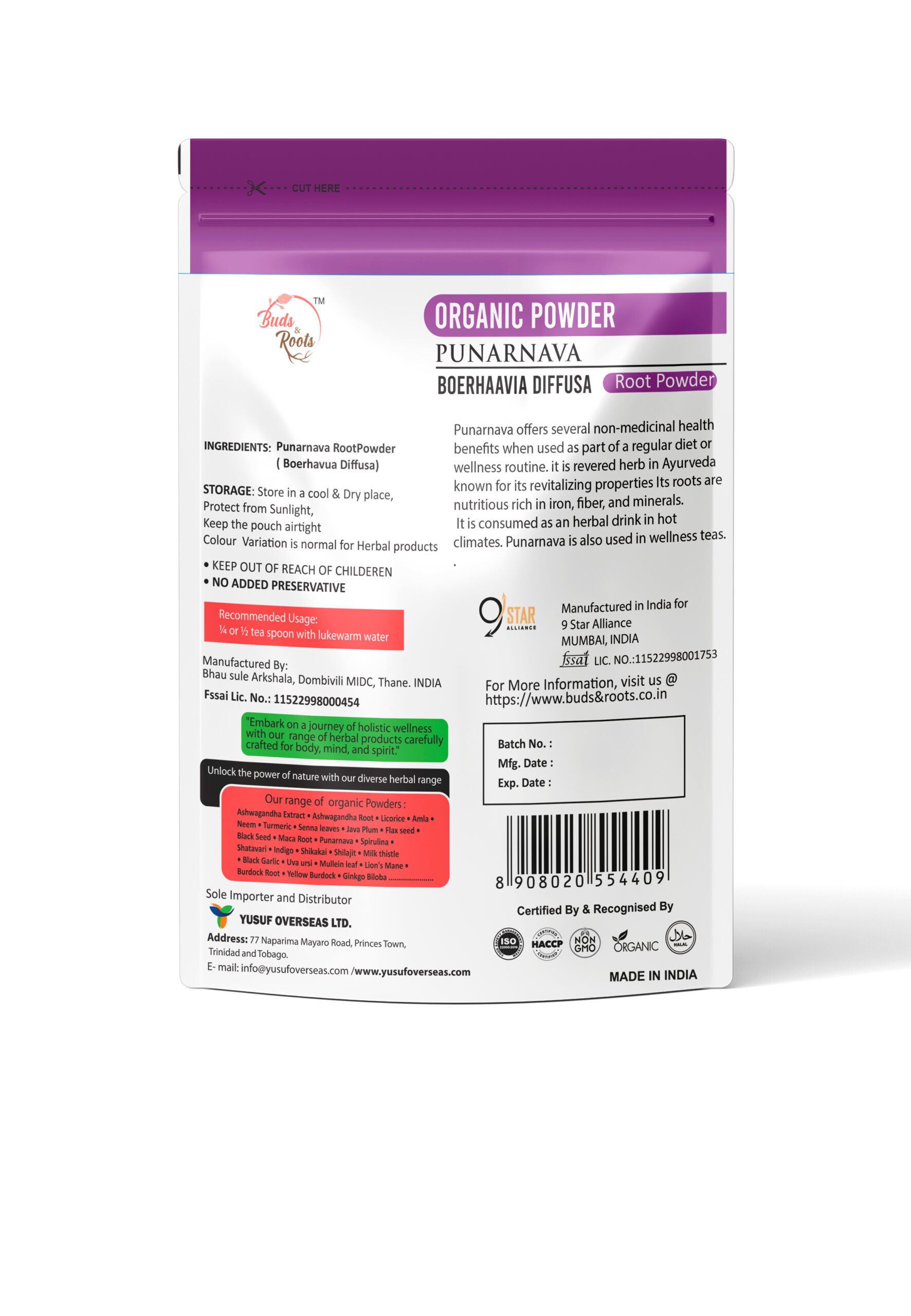 Buds & Roots Punarnava Powder is made from carefully selected and finely ground Punarnava herb (Boerhavia diffusa), a well-known plant in Ayurvedic wellness traditions. Punarnava has been traditionally valued for its supportive role in kidney health, fluid balance, and natural detoxification. Rich in beneficial plant compounds, it helps support digestive wellness and overall vitality. This versatile herbal powder can be easily incorporated into daily wellness routines for balanced health support.